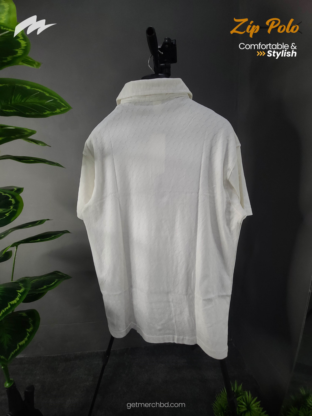 Jacquard Textured Old Money Polo Shirt Zipper Neck - White